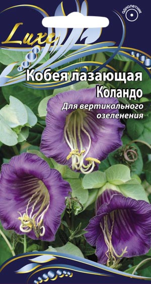 КОБЕЯ КОЛАНДО Для вертикального озеленения Шикарная быстрорастущая лиана с огромными колокольчиками, длиной до 4 м для вертикального озеленения. Листья крупные, перистые. Цветки сине-фиолетовые, диаметром 7–8 см, с длинными тычинками и пестиком, выходящими наружу. Предпочитает солнечные места. Цветет с июля до заморозков. Используют для озеленения беседок, балконов, оград.
